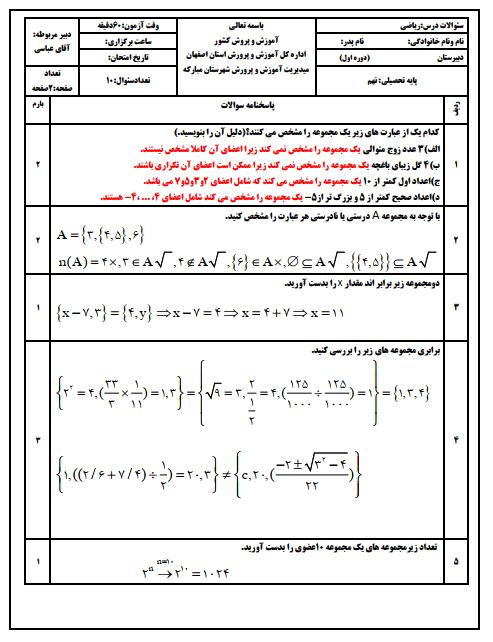 پاسخنامه تشریحی نمونه سوالات امتحانی فصل اول ریاضی پایه نهم
