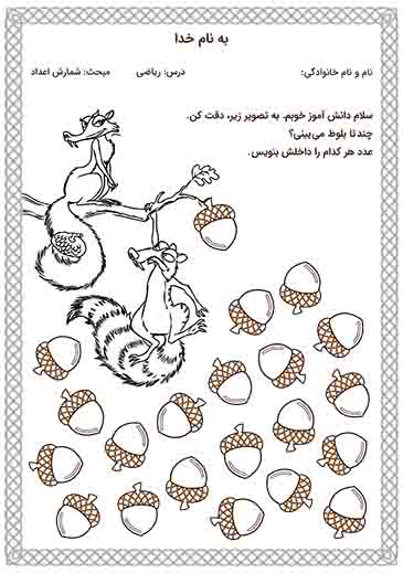 این کاربرگ شامل تمریی جذاب برای شمارش و نمایش اعداد یکرقمی و دورقمی است. دانشآموز باید تعداد شکلهای داخل تصویر را بشمارد و عدد مربوطه را بنویسد. استفاده از تصاویر دیداری باعث میشود یادگیری مفهوم عدد برای دانشآموزان پایه اول سادهتر و لذتبخشتر باشد.