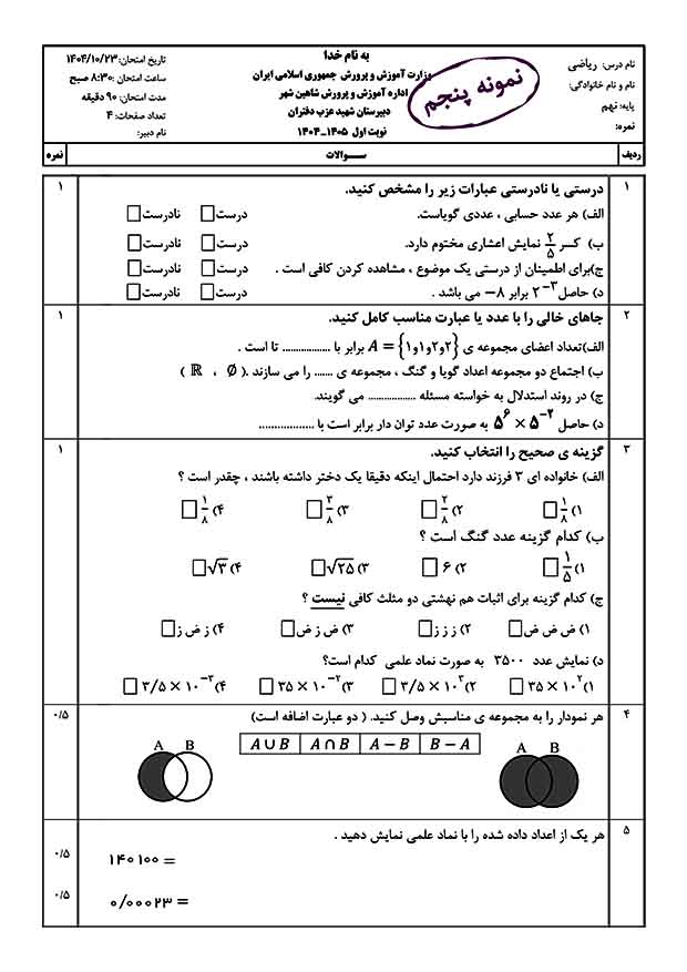 نمونه سوال امتحانی نوبت اول ریاضی پایه نهم (نمونه پنجم)