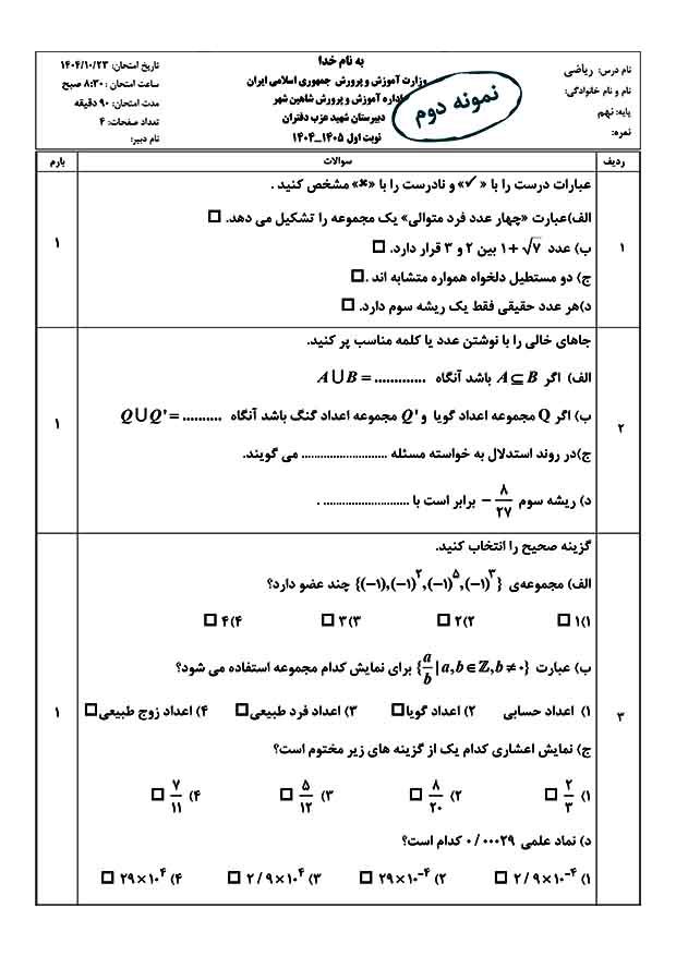 نمونه سوال امتحانی نوبت اول ریاضی پایه نهم (نمونه دوم)