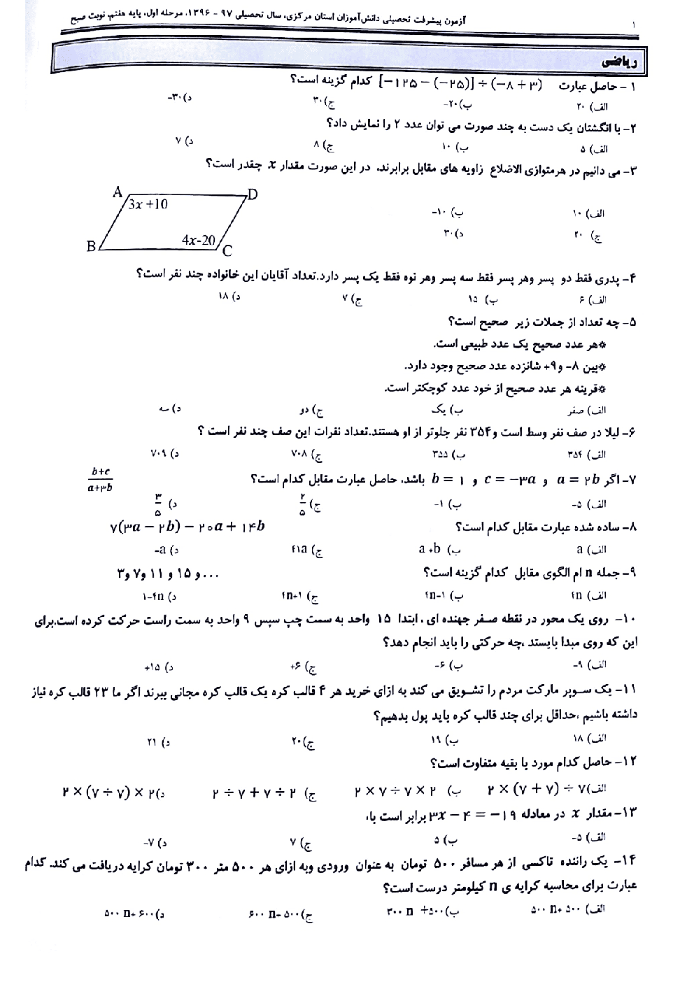 آزمون پیشرفت تحصیلی هفتم استان مرکزی_مرحله اول (آذر ۱۳۹6، نوبت صبح)