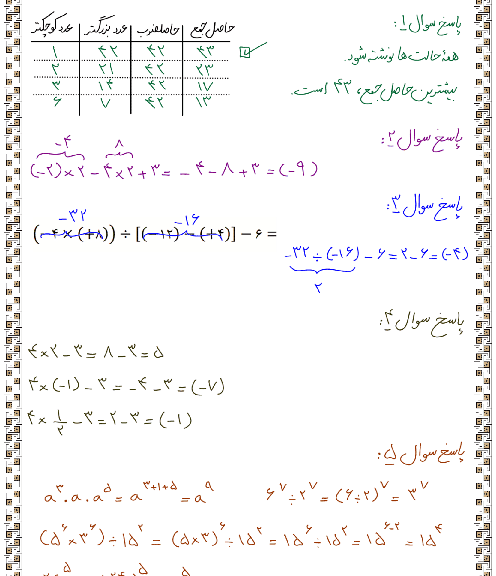 نمونه سؤالات مروری از فصل ۱ تا ۷ ریاضی هفتم