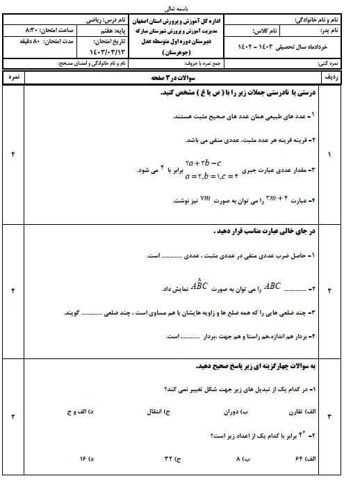 نمونه سوالات نوبت دوم ریاضی هفتم سوالات استاندارد از فصل های اول تا نهم ریاضی هفتم به صورت صحیح و غلط، جای خالی، تستی و تشریحی طراحی شده است. تعداد 9 سوال در 3 صفحه قرار دارد.