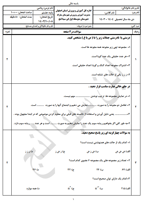 فایل ورد نمونه سوالات امتحانی نوبت اول ریاضی پایه نهم