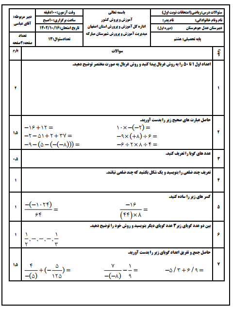 نمونه سوالات فصل اول تا سوم ریاضی پایه هشتم سوالات تشریحی و مفهومی از فصل اول ریاضی هشتم عددهای صحیح و گویا ، فصل دوم ریاضی هشتم عددهای اول و فصل سوم ریاضی هشتم چندضلعی ها به صورت استاندارد طراحی شده است. تعداد 13 سوال در 2 صفحه قرار دارد.
