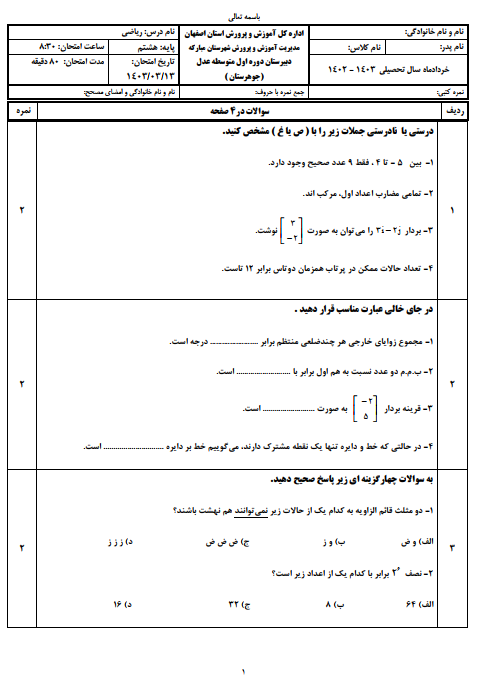 نمونه سوالات امتحانی نوبت دوم ریاضی پایه هشتم
