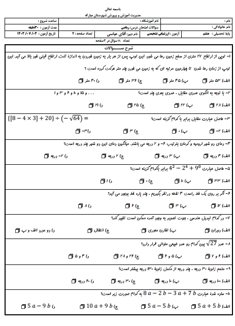 آزمون آغازین ریاضی پایه هشتم منظور از ارزشیابی آغازین یا آزمون آغازین نوعی ارزشیابی یا سنجشی است که در آغاز درس و پیش از شروع فعالیتهای آموزشی معلم و کوششهای یادگیری دانش آموزان اجرا می شود. این سوالات از مطالب ریاضی پایه هفتم برای پاسخ گویی به سوالات زیر طراحی شده است: ۱. آیا یادگیرندگان بر دانش ها و مهارت های پیش نیاز درس های ریاضی هشتم از قبل تسلط یافته اند؟ ۲. یادگیرندگان چه مقدار از هدف ها و محتوای درس های ریاضی هشتم را از قبل یاد گرفته اند؟