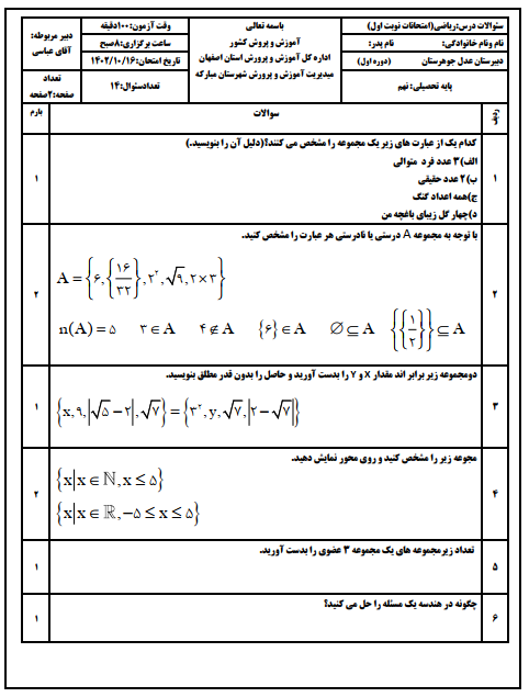 نمونه سوالات امتحانی فصل اول تا سوم ریاضی پایه نهم