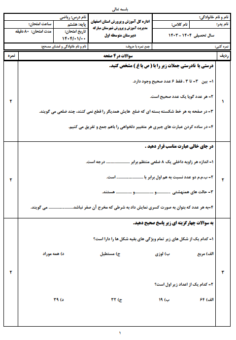 نمونه سوالات امتحانی فصل اول تا ششم ریاضی پایه هشتم