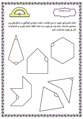 برای تمرین کار با نقاله و نحوهی اندازهگیری زوایا، این کاربرگ با ظاهری زیبا طراحی شده است تا امر آموزش و تمرین را برای دانشآموزان و آمزگاران عزیز، تسهیل کند.