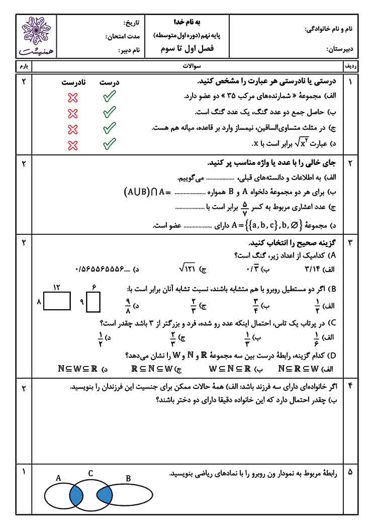نمونه سوال شگفتانگیز ریاضی نهم (فصل یک تا سه)