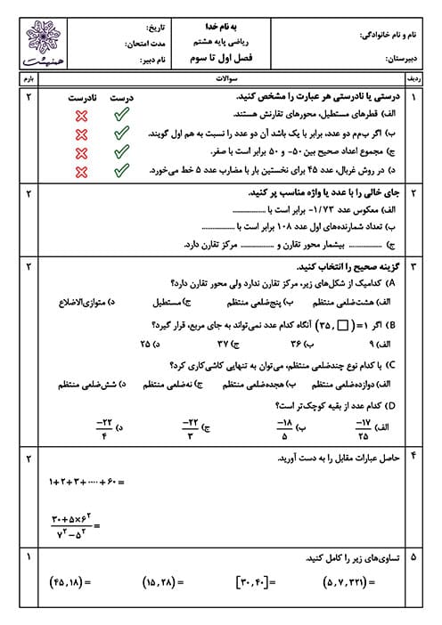 آزمون ترکیبی از فصل یک تا سه ریاضی هشتم با پوشش تمام مباحث مورد نیاز: