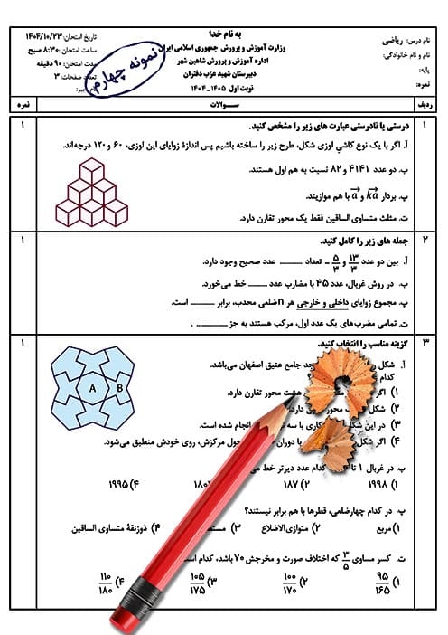 آزمون جامع نوبت اول ریاضی هشتم (نمونۀ چهارم)