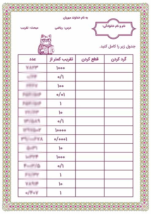 یکی از مباحث کتاب ریاضی ششم، تقریب زدن به روش قطع کردن و گرد کردن میباشد. در این کاربرگ سعی شده تا با مثالهای گوناگون، امر یادگیری و تمرین را برای دانشآموزان و امر آموزش را برای آموزگاران محترم، آسانتر سازد. کاربرگ با ظاهری جذاب طراحی شده تا رغبت دانشآموزان برای تمرین این مبحث، بیشتر گردد.