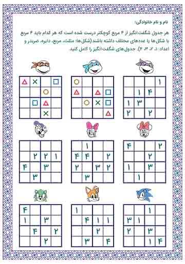 شامل 23 جدول شگفتانگیز با اندازههای مختلف 4×4، 6×6 و 9×9 است که ویژهی دانشآموزان پایه اول دبستان طراحی شده است. جدولها با ترکیب تمرینهای عددی و رنگآمیزی، علاوه بر تقویت مهارتهای ریاضی، دقت، نظم ذهنی و تمرکز دانشآموزان را افزایش میدهند. ظاهر جذاب و طراحی کودکپسند این کاربرگ باعث میشود کودکان با علاقه بیشتری به حل جدولها بپردازند و مفاهیم ریاضی را در قالبی سرگرمکننده تمرین کنند.