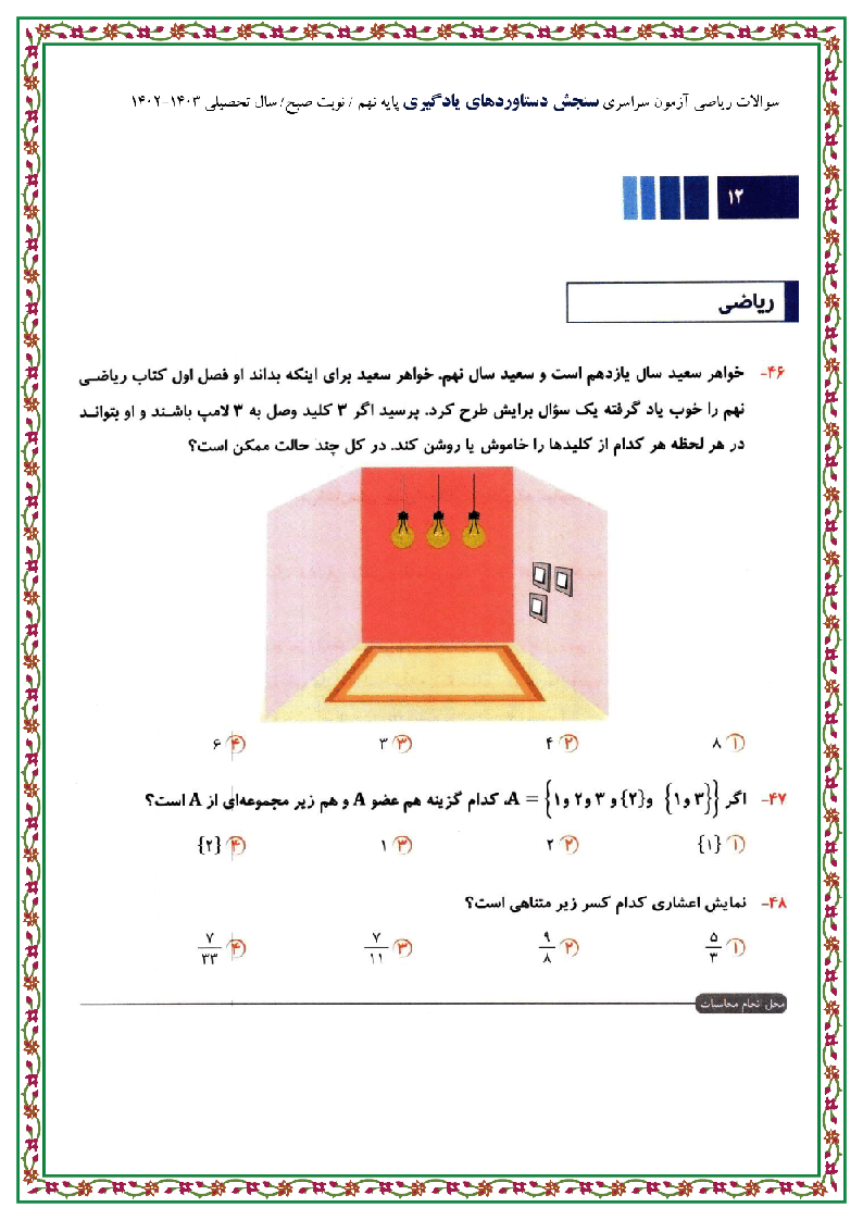 سوالات ریاضی آزمون سراسری سنجش دستاوردهای یادگیری پایه نهم 1402