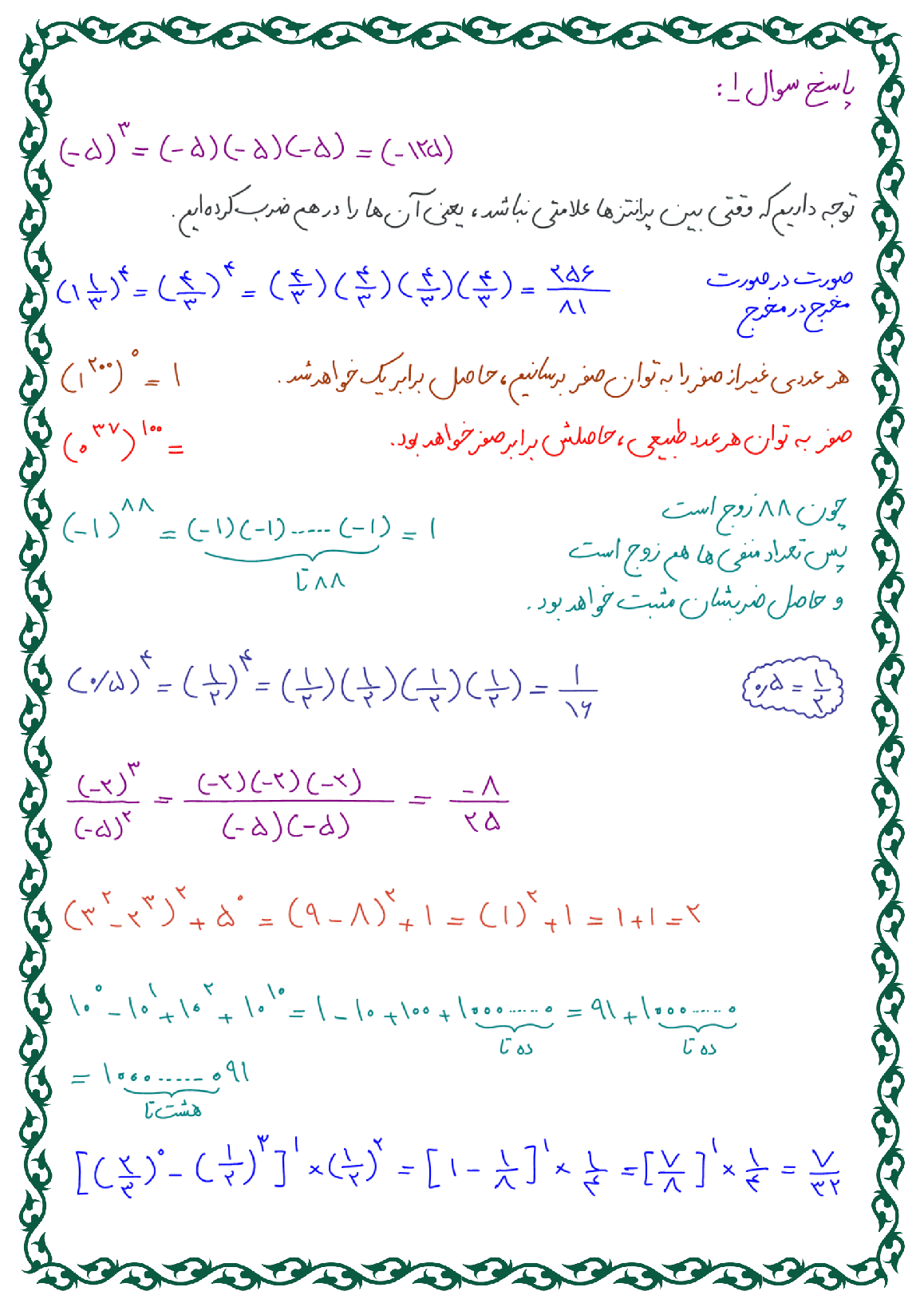 نمونه سوالات فصل 7 ریاضی پایه هفتم (توان و جذر)