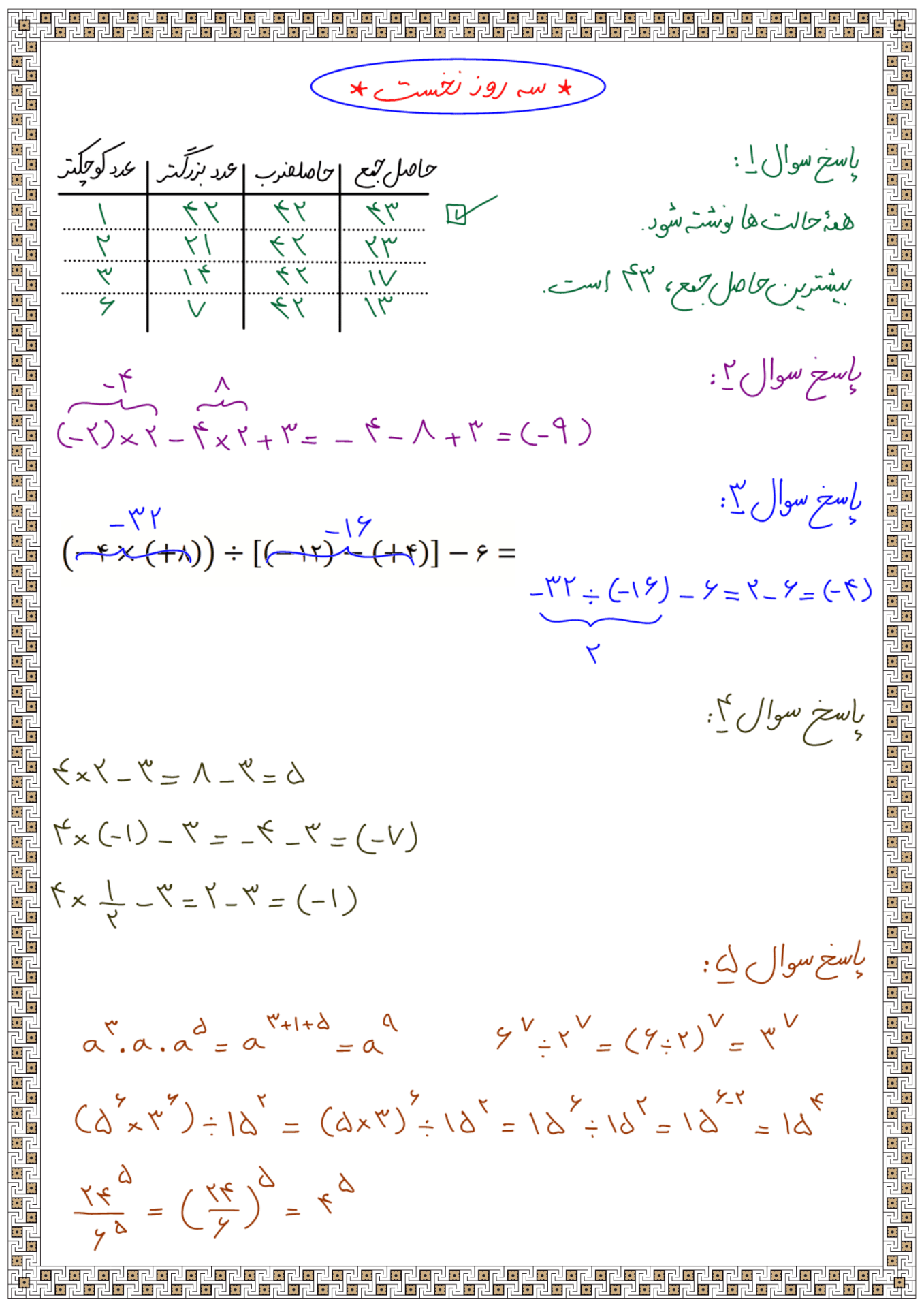 نمونه سؤالات مروری از فصل ۱ تا ۷ ریاضی هفتم