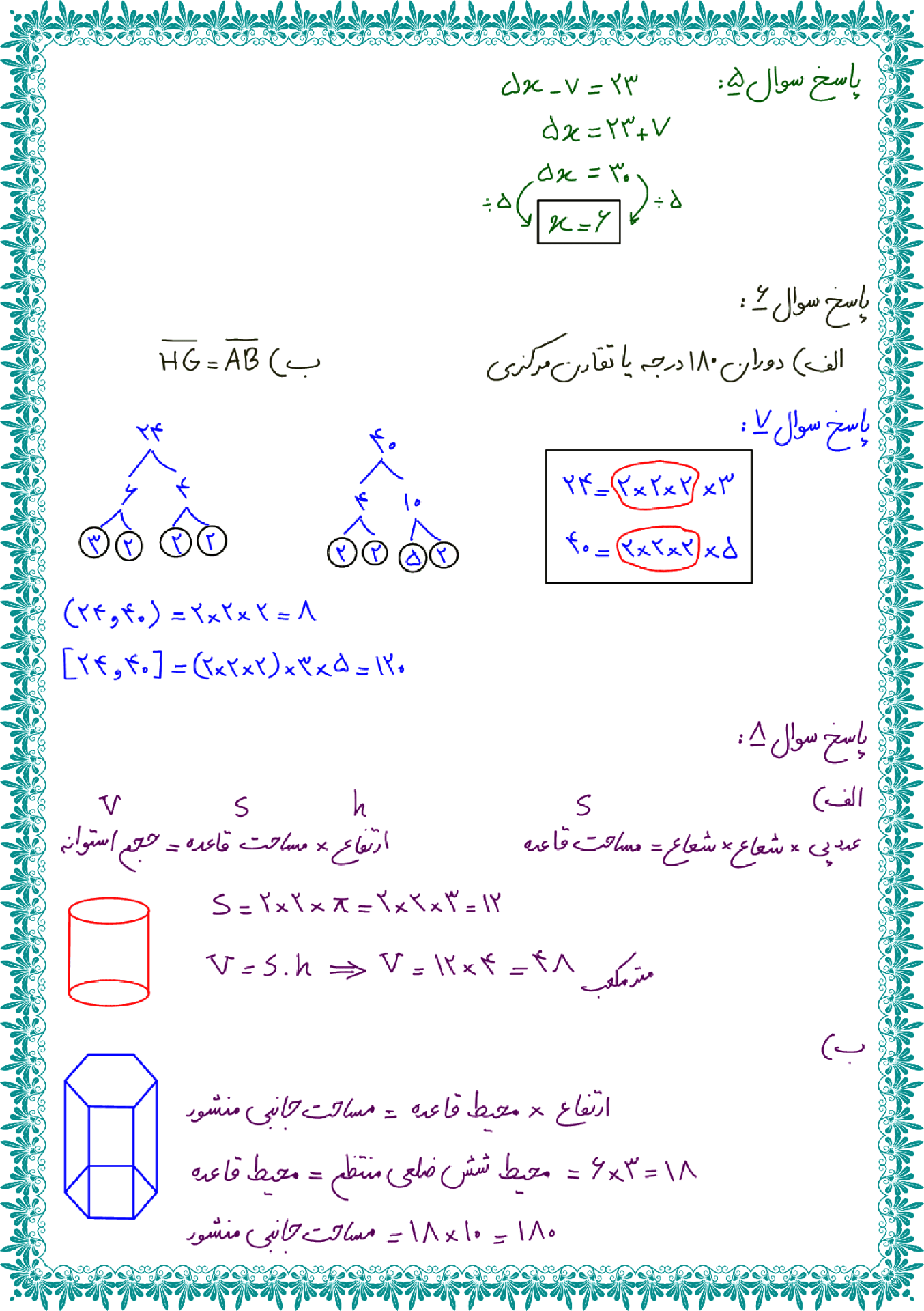 نمونه سوال امتحانی از فصل 5 و 6 و 7 و 8 ریاضی هفتم(سری نخست)