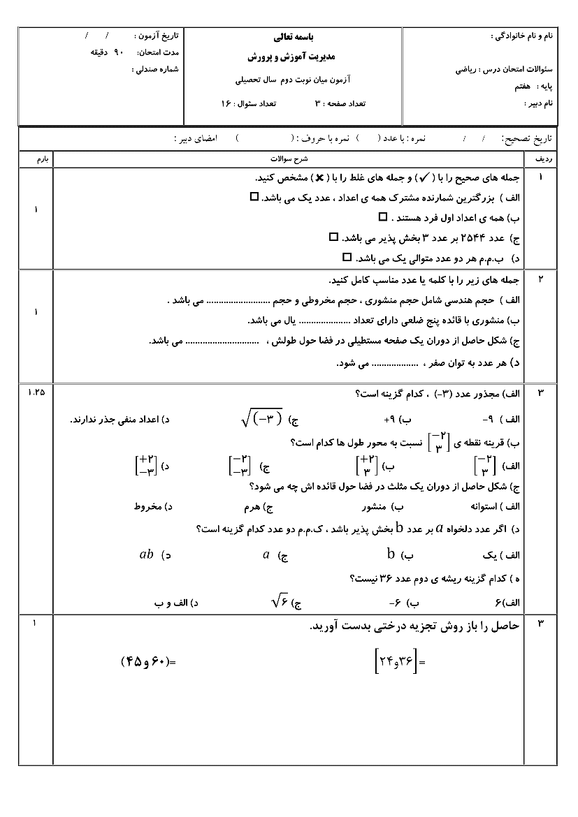 نمونه سوال امتحانی از فصل 5 و 6 و 7 و 8 ریاضی هفتم(سری دوم)