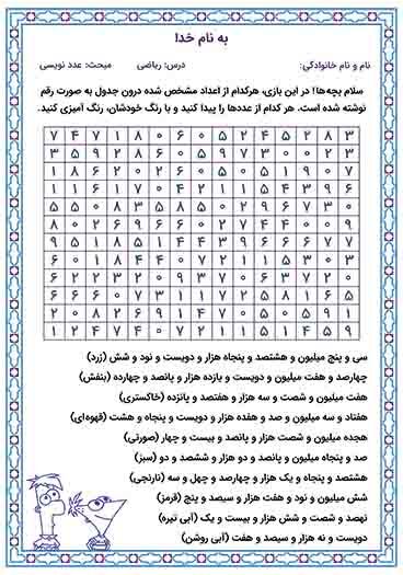 این کاربرگ برای تمرین مبحث عددنویسی و معرفی میلیون از فصل اول ریاضی پایه چهارم طراحی شده است. ظاهر جذاب و تمرینهای کاربردی آن باعث میشود دانشآموزان با علاقه بیشتری مفاهیم مربوط به خواندن و نوشتن اعداد بزرگ را یاد بگیرند و تمرین کنند.