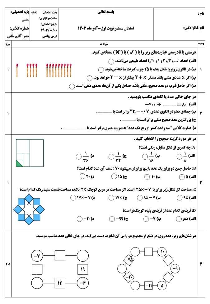 نسخۀ قابل ویرایش سه نمونه سوال طلایی ریاضی هفتم (فصل یک تا سه)