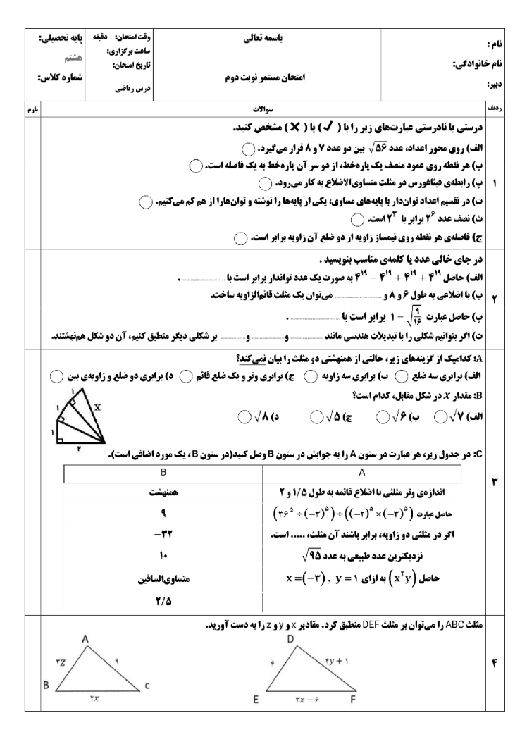 آزمون ترکیبی از فصل یک تا سه ریاضی هشتم با پوشش تمام مباحث مورد نیاز: